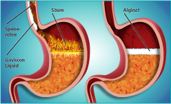 - Eine kleine Menge Hydrogencarbonat bildet Kohlendioxid und sorgt dafür, dass sich die Schutzschicht, bzw. die Gelbarriere auf dem Mageninhalt ausbildet. Diese Schutzschicht fungiert als starke physikalische Barriere gegen Reflux. So wird das Aufsteigen von saurem Mageninhalt in die Speiseröhre mechanisch verhindert.